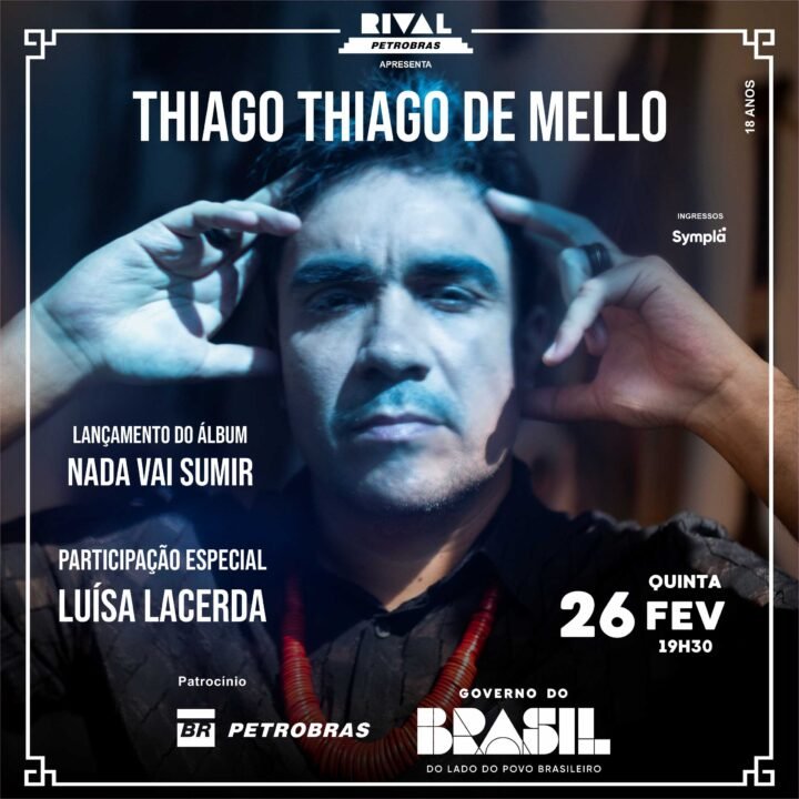 O cantor e compositor Thiago Thiago faz show de lançamento do álbum “Nada vai sumir”, mostrando a estética florestal de seu cancioneiro, que celebra a natureza, a memória e o sonho de um país mais amazônico. Ele aproveita para homenagear o pai, o poeta amazonense Thiago de Mello (1926-2022), que faria 100 anos em 2026. Participação especial da cantora Luísa Lacerda.