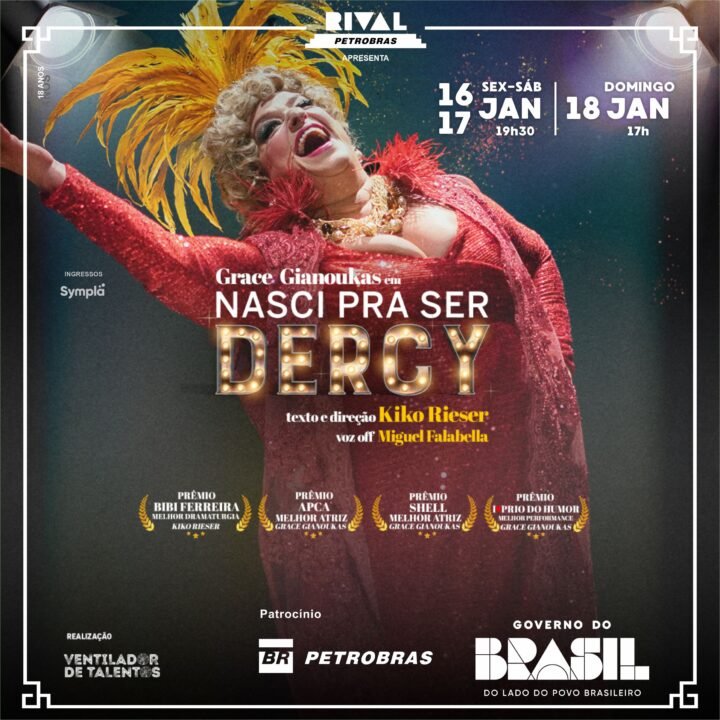 A atriz Grace Gianoukas volta com o espetáculo “Nascy pra ser Dercy”, homenagem a Dercy Gonçalves, artista que rompeu padrões e inaugurou uma representação genuinamente brasileira em nossos palcos. Com voz off de Miguel Falabella, o premiado monólogo mostra a importância, muitas vezes ignorada, de Dercy para o teatro brasileiro e para a liberdade feminina.