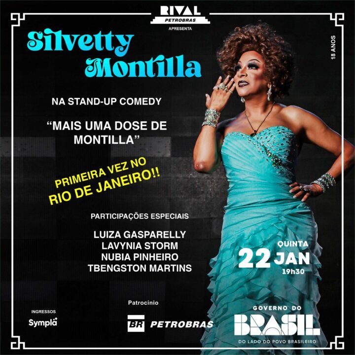 A incrível Silvetty Montilla apresenta-se em “Mais uma dose de Montilla”. O espetáculo é uma mistura de stand-up com show de performance de drag e vai contar com duas participações especiais: Luiza Gasparelly, Lavynia Storm, Nubia Pinheiro e Tbengston Martins.