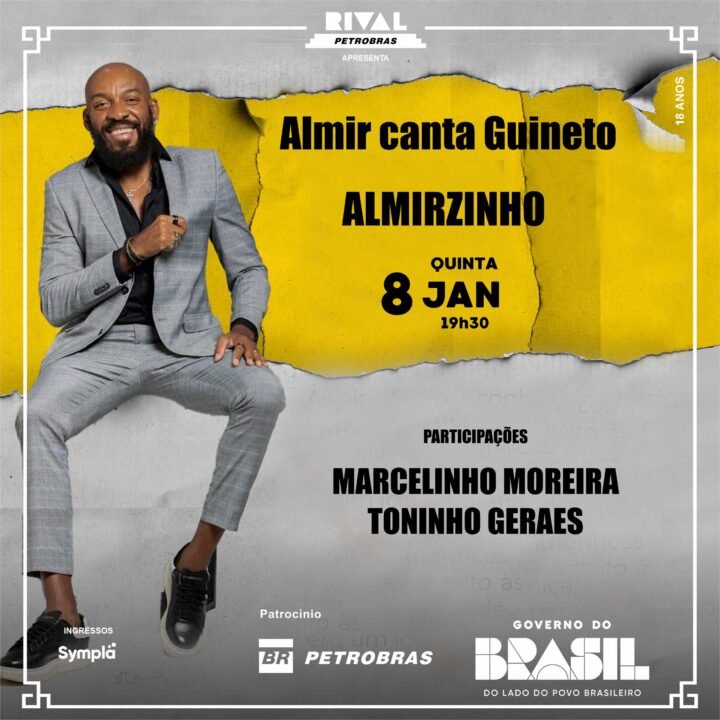 O espetáculo “Almir Canta Guineto” comemora os 80 anos de nascimento do saudoso Almir Guineto. No show, é Almir Serra, o Almirzinho, filho do homenageado, que revisita a obra do poeta Almir Guineto. Entre os sucessos do repertório, estão clássicos como “Conselho”, “Caxambu”, “Lama nas ruas”, “Insensato destino” e “Mel na boca”. O show contará as participações especiais de Toninho Geraes e Marcelinho Moreira.