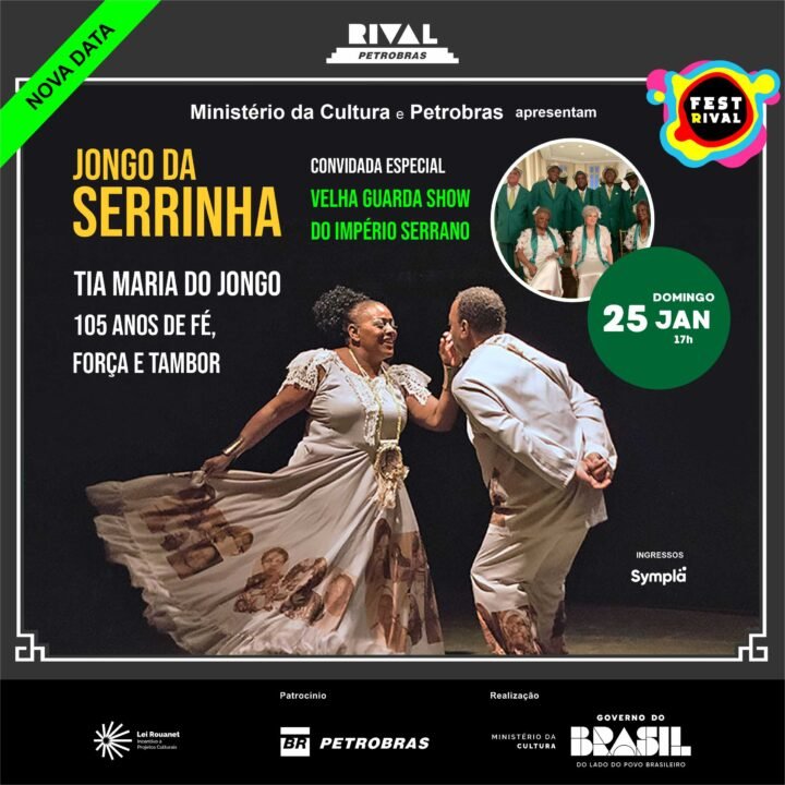 Jongo da Serrinha convida a Velha Guarda Show do Império Serrano para participar do espetáculo “Tia Maria do Jongo – 105 anos de fé, força e tambor”. O jongo, o samba e a memória unem-se para celebrar Tia Maria do Jongo, uma guerreira, que transformou o tambor em eternidade. Um tributo à vida e ao legado da matriarca do Jongo da Serrinha, símbolo da resistência cultural afro-brasileira.