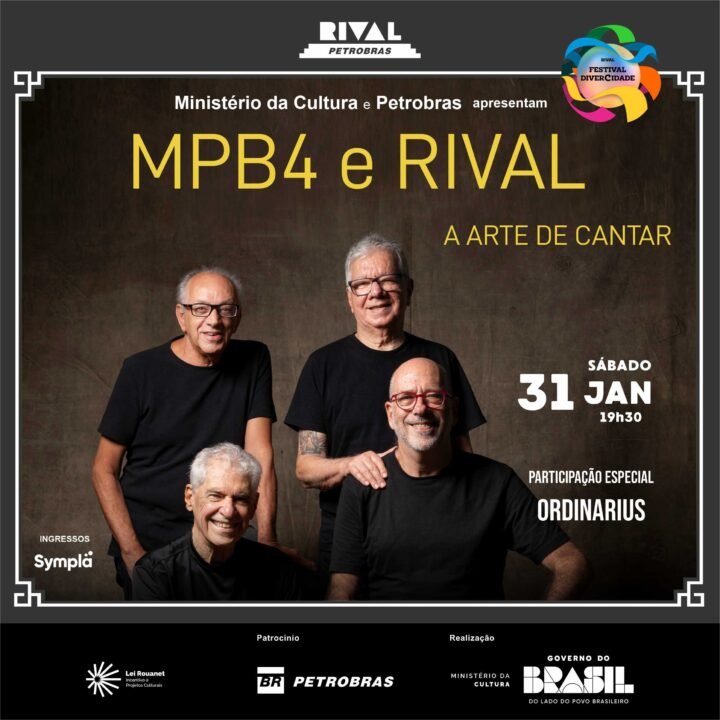 Com mais de 60 anos de carreira, o MPB4 retorna ao Teatro Rival Petrobras com o show “MPB4 e Rival – A arte de cantar” no dia 31 de janeiro. O espetáculo revisita shows históricos do grupo no lendário teatro, que considera sua casa, e presta homenagem a Angela Leal, visionária que abriu as cortinas do Rival para a Música Popular Brasileira.