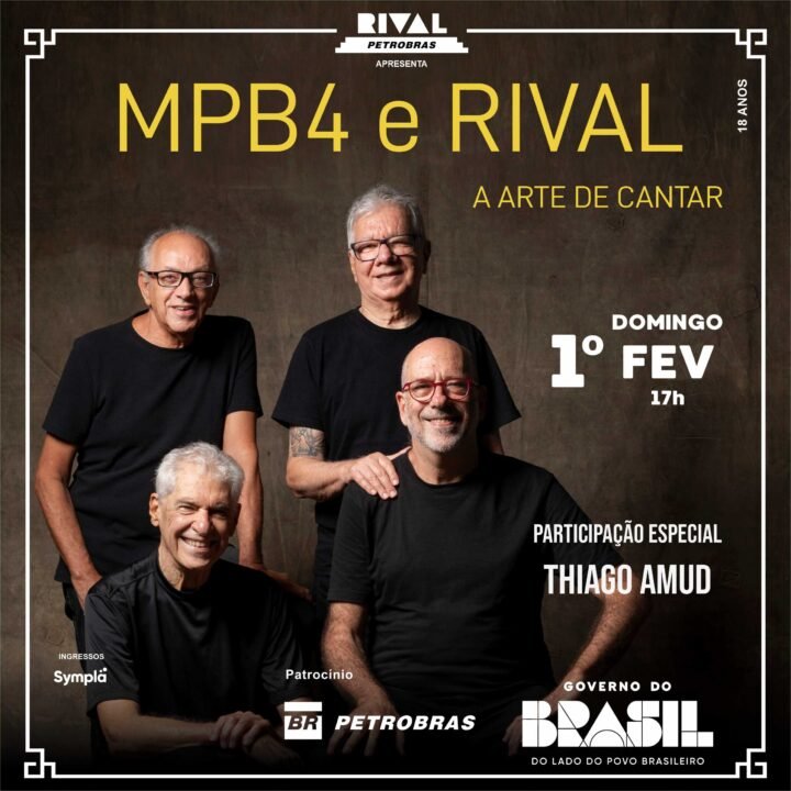Com mais de 60 anos de carreira, o MPB4 retorna ao Teatro Rival Petrobras com o show “MPB4 e Rival – A arte de cantar” no dia 1º de fevereiro. O espetáculo revisita shows históricos do grupo no lendário teatro, que considera sua casa, e presta homenagem a Angela Leal, visionária que abriu as cortinas do Rival para a Música Popular Brasileira.