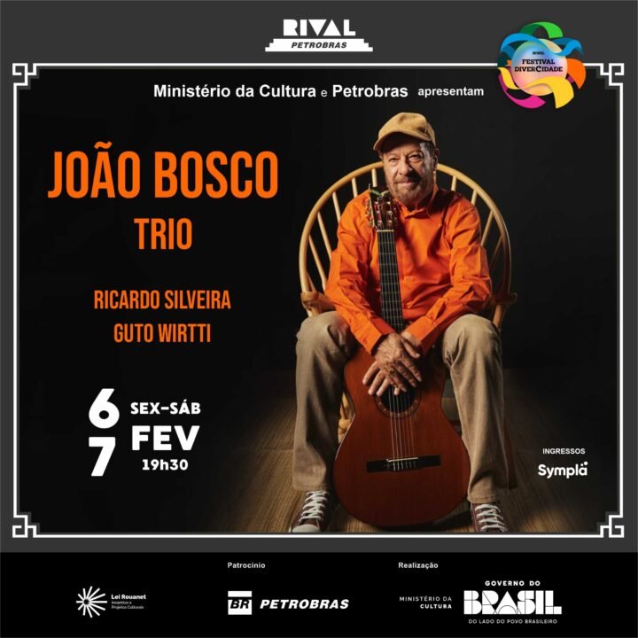 O consagrado cantor, compositor e violonista João Bosco sobe novamente ao palco do Teatro Rival Petrobras nos dias 6 e 7 de fevereiro, para duas noites especiais em formato de trio. A seu lado, estarão os músicos de longa parceria – o guitarrista Ricardo Silveira e o contrabaixista Guto Wirtti – numa formação intimista e afetiva, perfeita para revisitar clássicos da carreira e celebrar a história viva da música deste grande nome da MPB.
