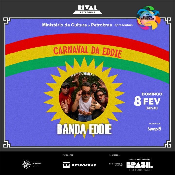 Em fevereiro, tem follia no Teatro Rival Petrobras! No dia 8, a Banda Eddie apresenta o “Carnaval da Eddie”, um show que celebra a essência que acompanha o grupo desde sua origem em Olinda, funcionando como uma síntese viva do percurso musical da banda criadora do Original Olinda Style. No roteiro, estarão os grandes sucessos que marcaram sua trajetória de 35 anos, músicas nascidas da vivência intensa da banda no carnaval recifense e olindense.