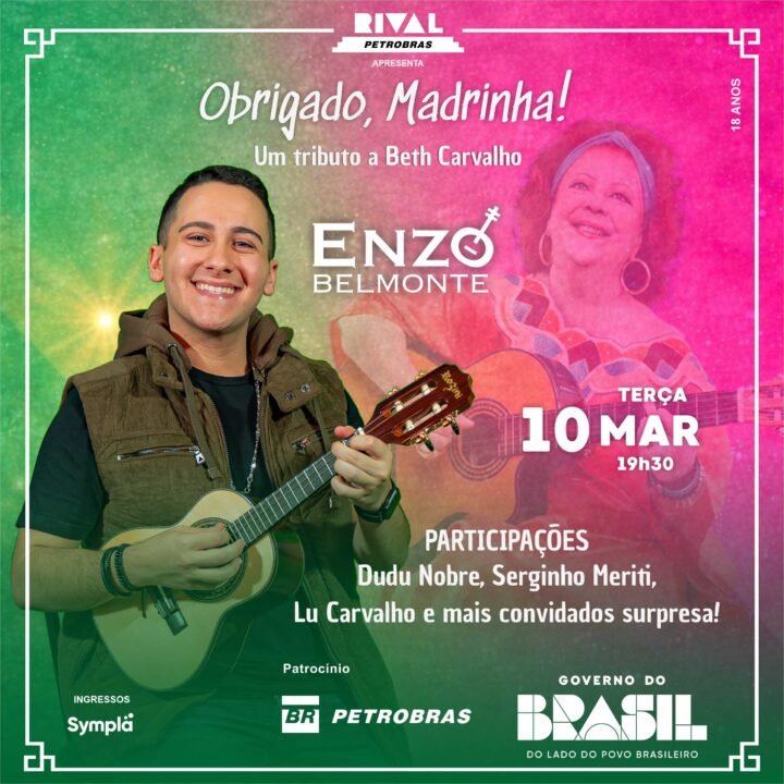 O cantor, compositor e instrumentista Enzo Belmonte apresenta o espetáculo “Obrigado, Madrinha: um tributo a Beth Carvalho”.